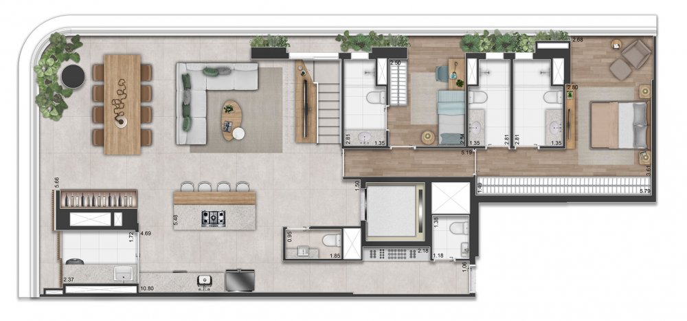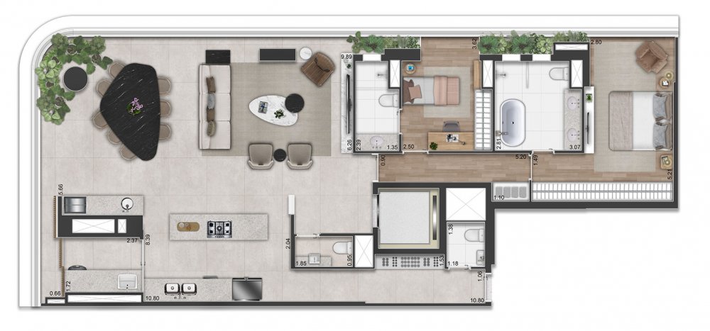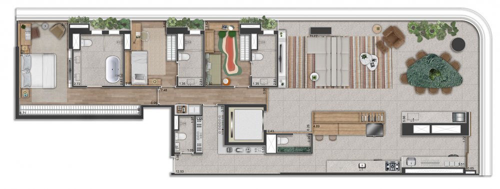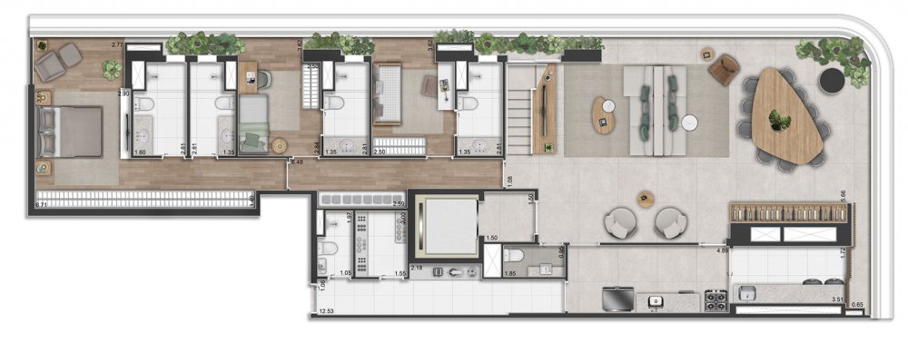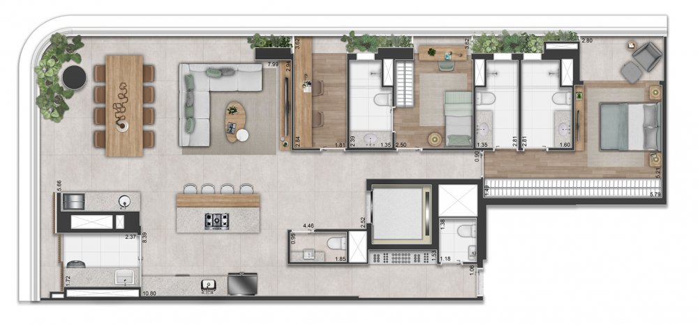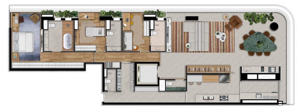 Seus amplos apartamentos foram pensados para trazer à rotina do morador muito conforto, com plantas de 154m² com 3 suítes, 193m² com 4 suítes, duplex de 392m² com 4 suítes e duplex de 300m² com 3 suítes.