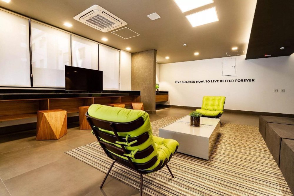 Piscina panorâmica, academia 24 h, lavanderia coletiva, coworking e bicicletário: tudo no próprio condomínio.