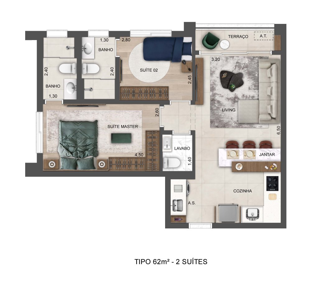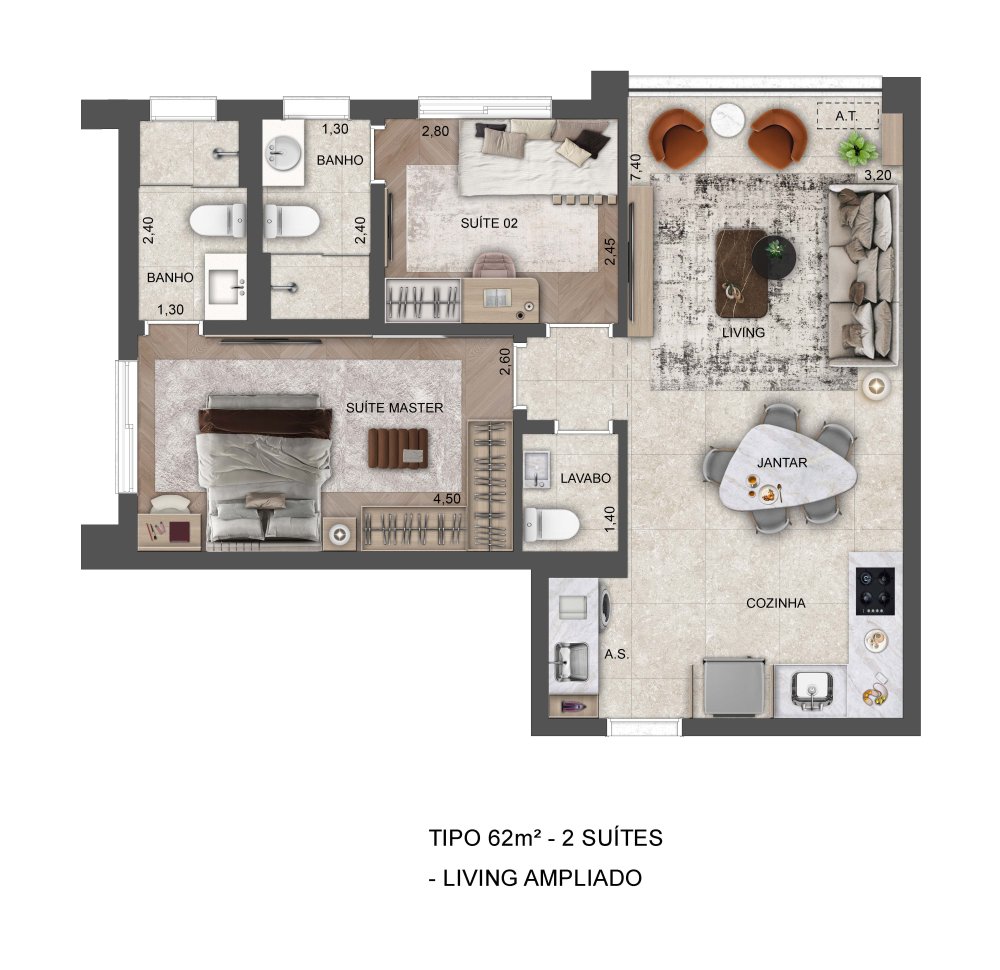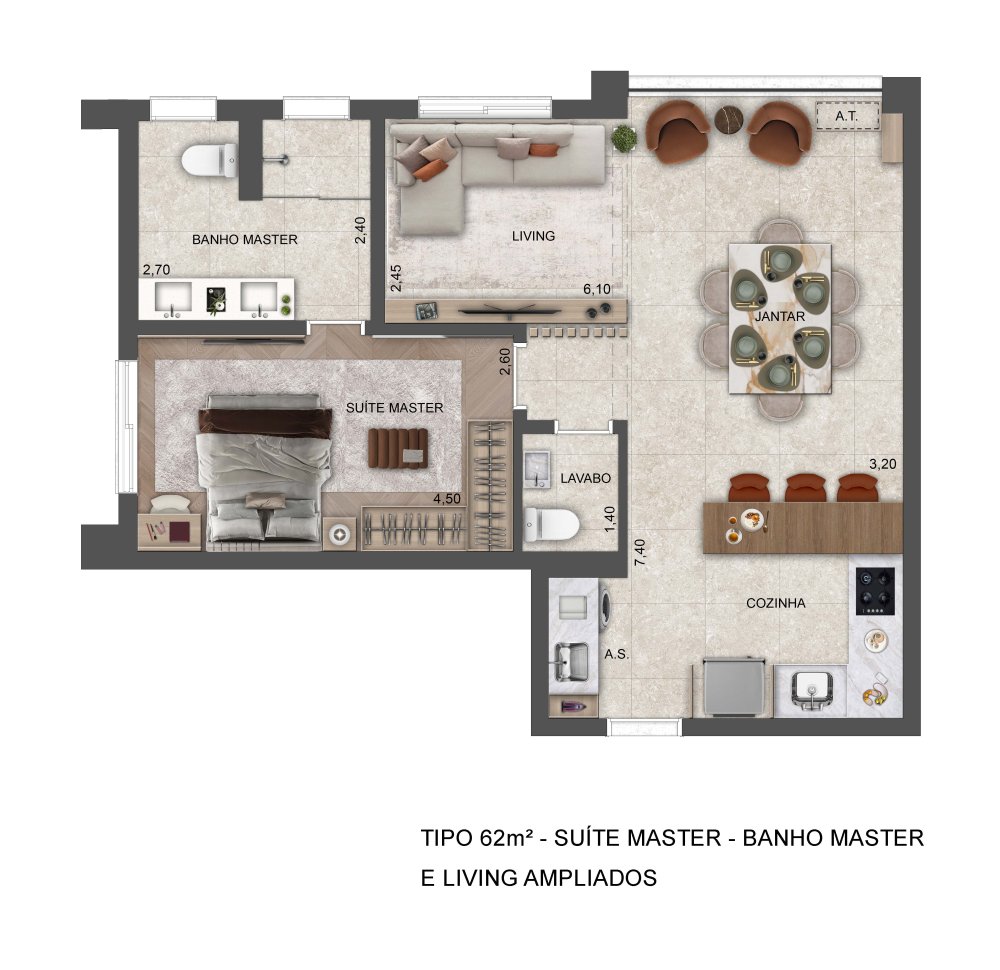 - Área Privativa: 62,85 m²