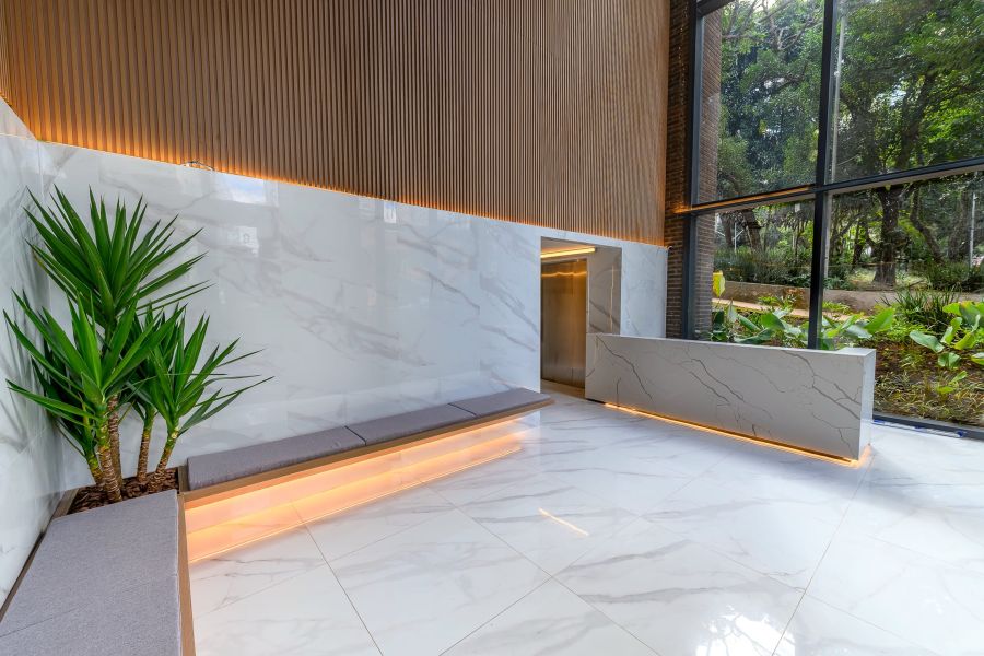 Recepção com balcão e pé-direito triplo