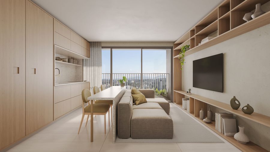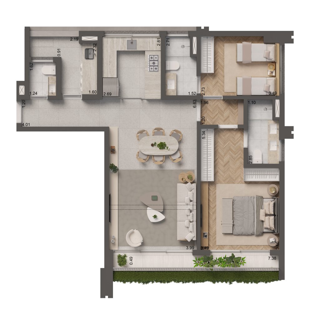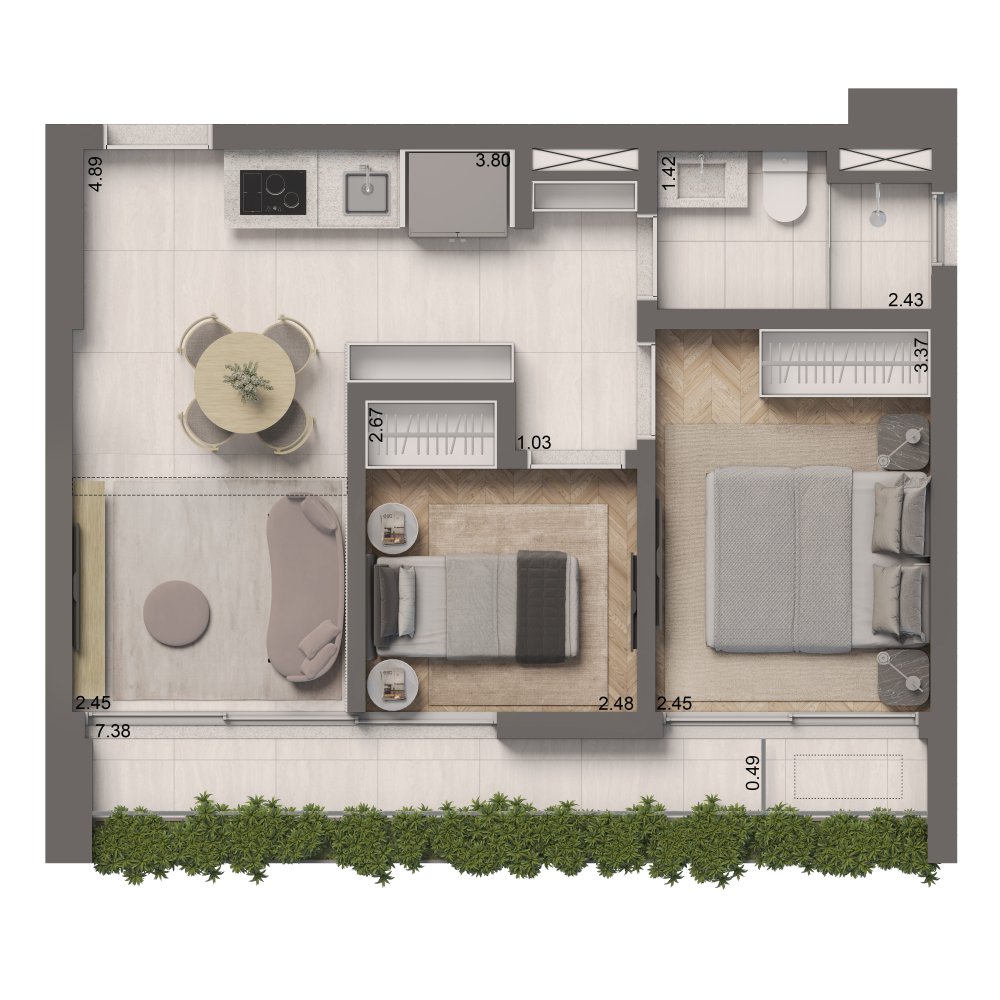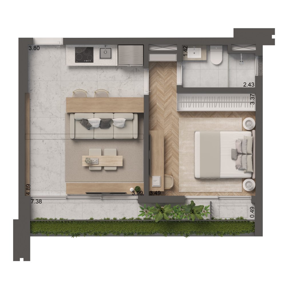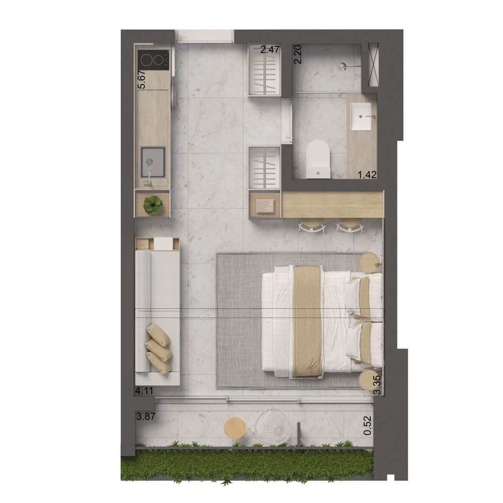 3º ao 12º pavimento - apartamentos compactos de 31m² (6 por andar), 46m² (2 por andar) e 50m² (2 por andar) - 13º ao 22º pavimento - apartamentos de 65m² (3 por andar) e 103m² (2 por andar).