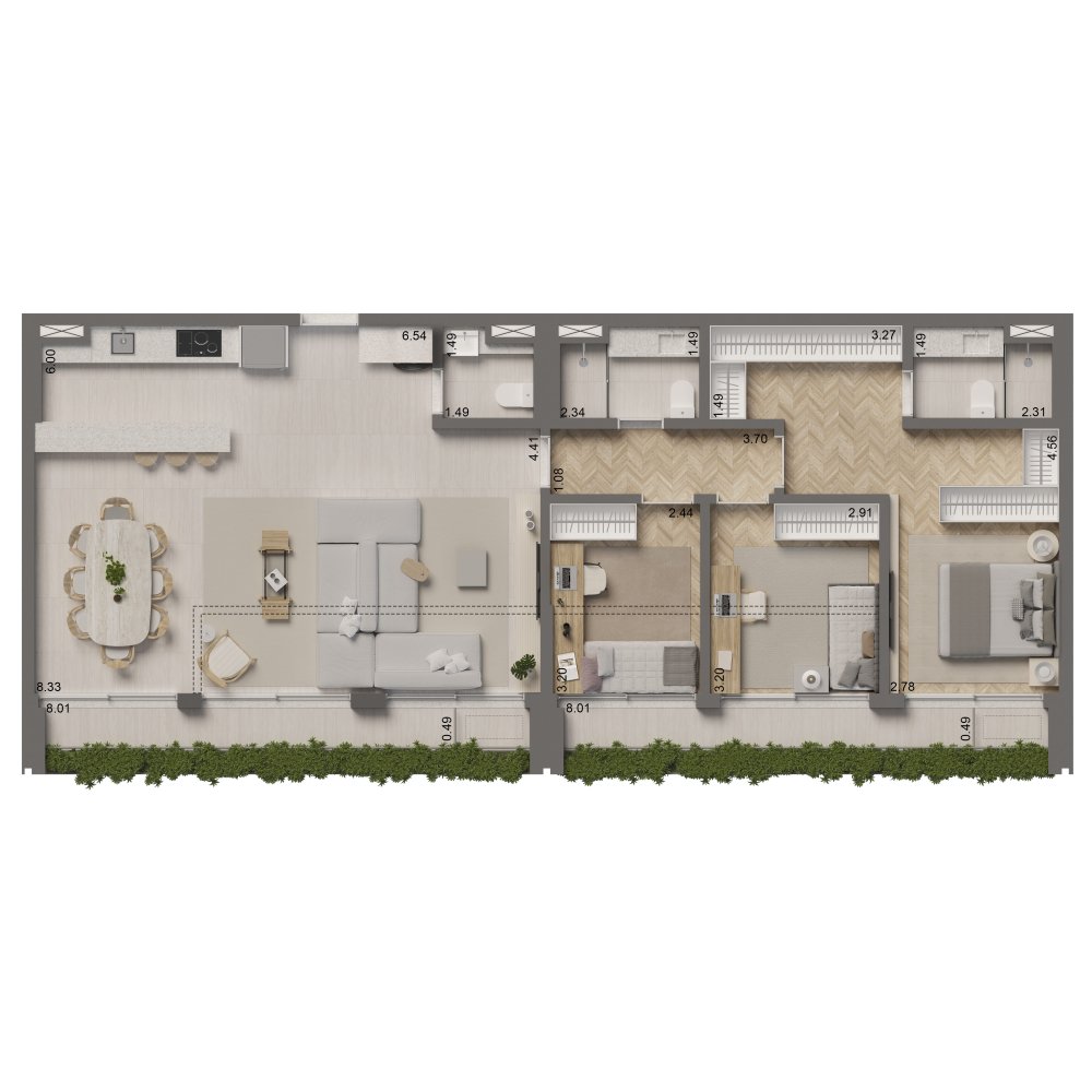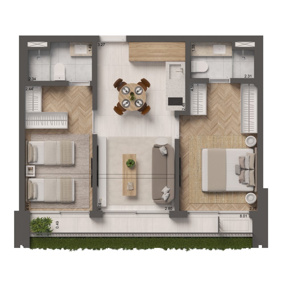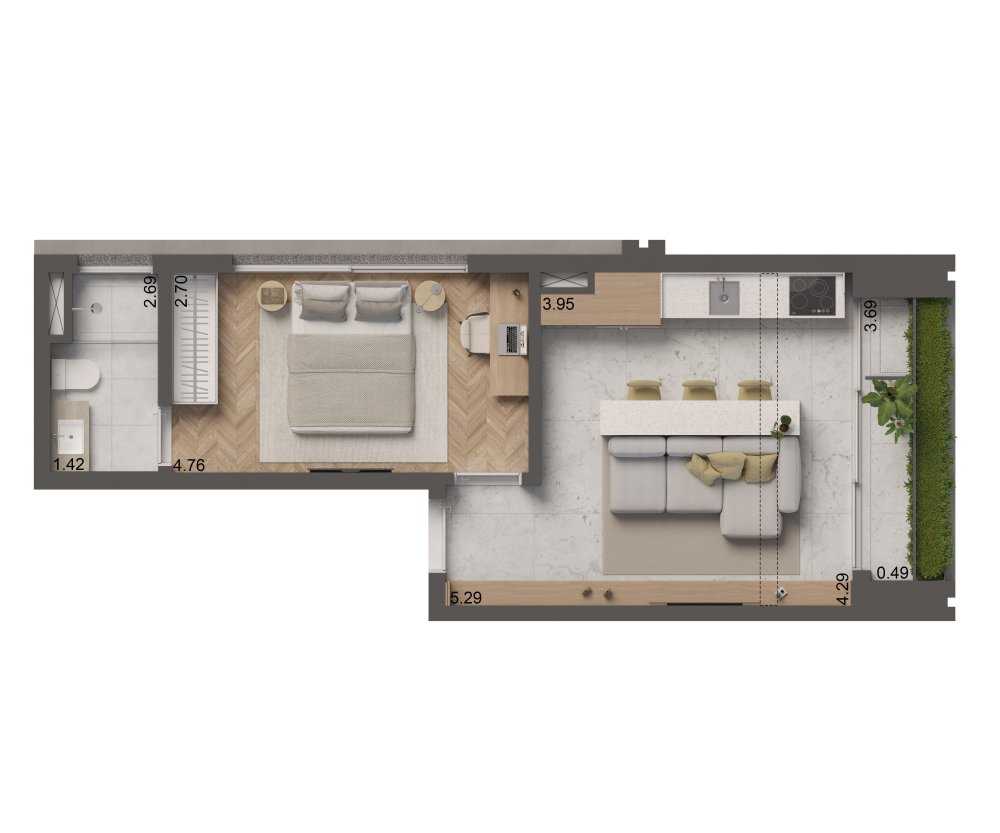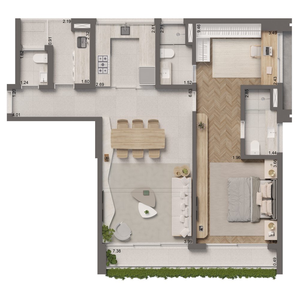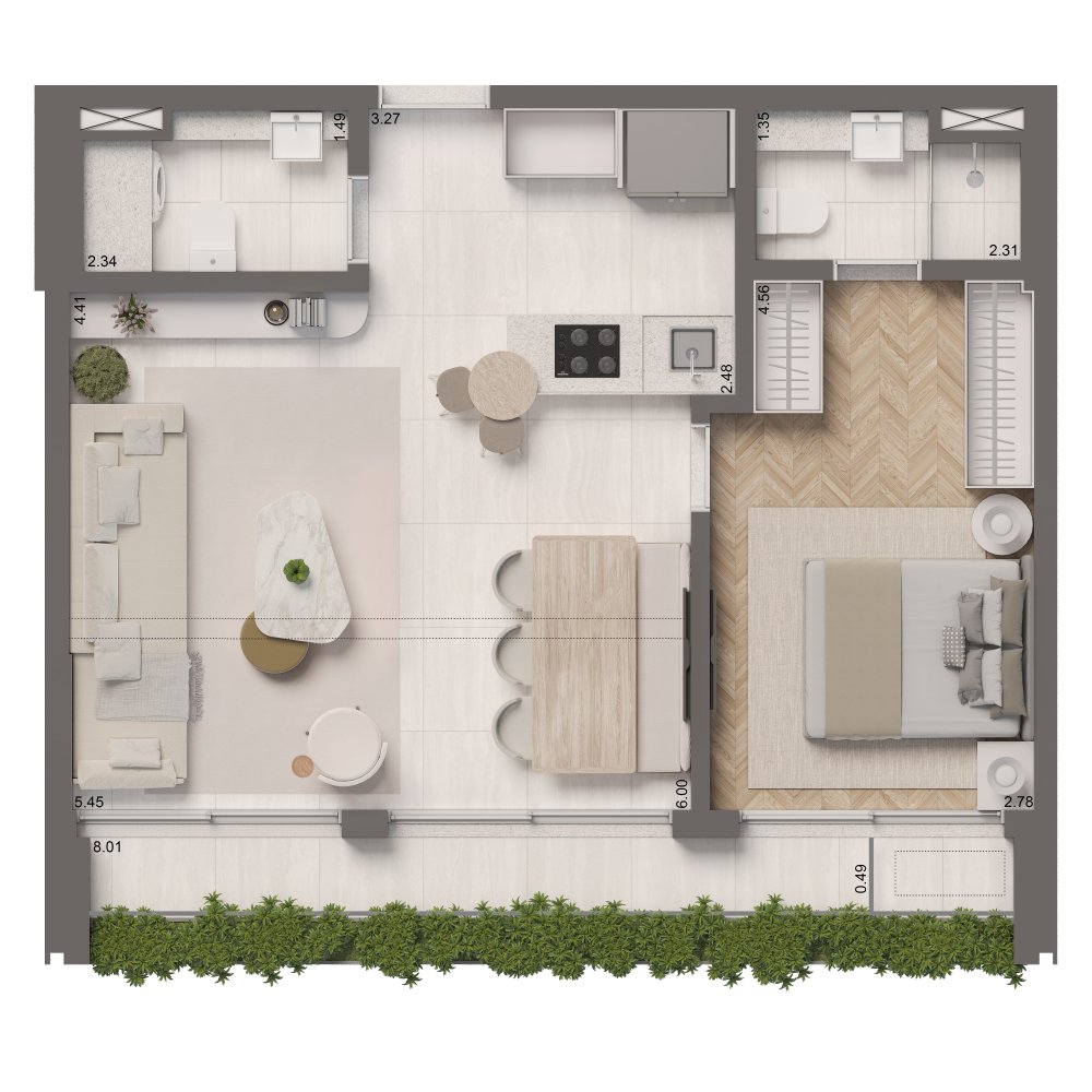3º ao 12º pavimento - apartamentos compactos de 31m² (6 por andar), 46m² (2 por andar) e 50m² (2 por andar) - 13º ao 22º pavimento - apartamentos de 65m² (3 por andar) e 103m² (2 por andar).