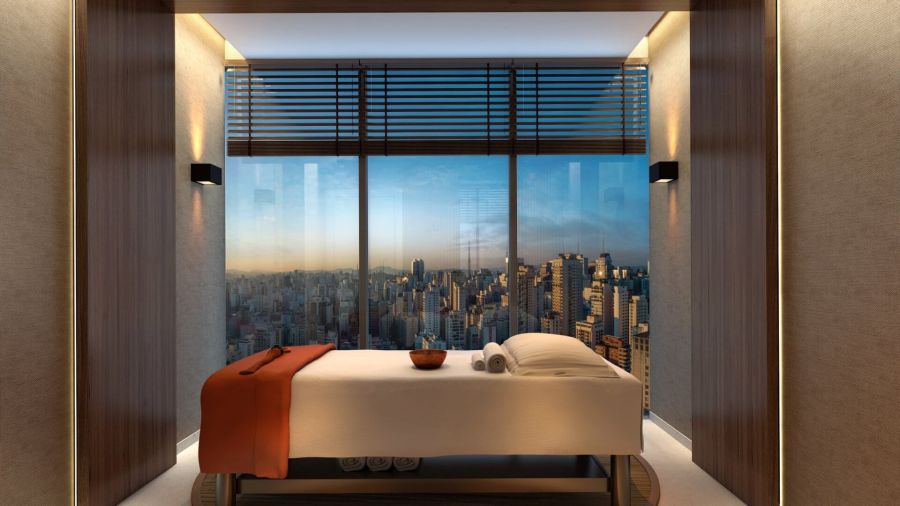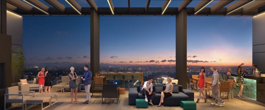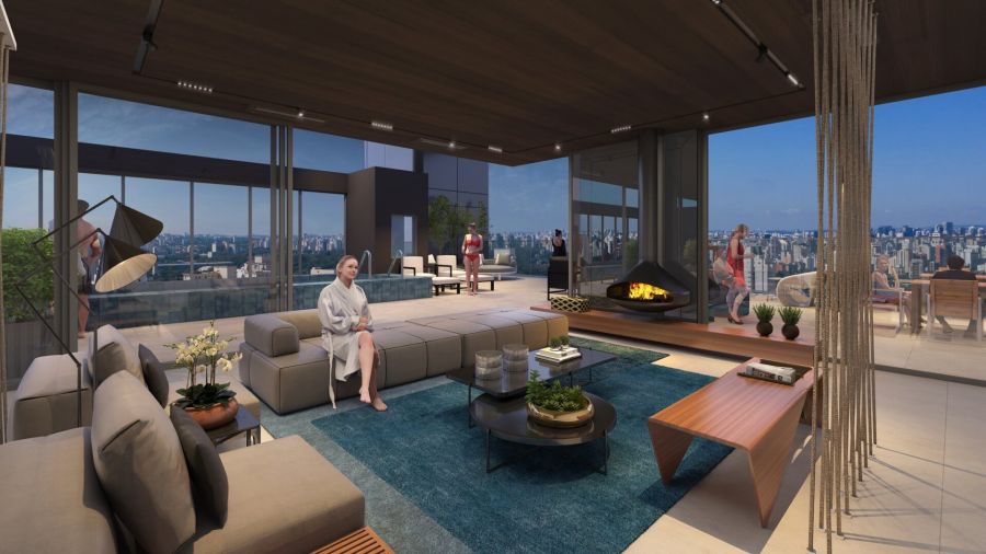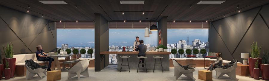 Um espaço exclusivo de convivência diurna ou noturna, com um bar moderno, pé direito de 6 metros e uma vista eterna para o Jardins.