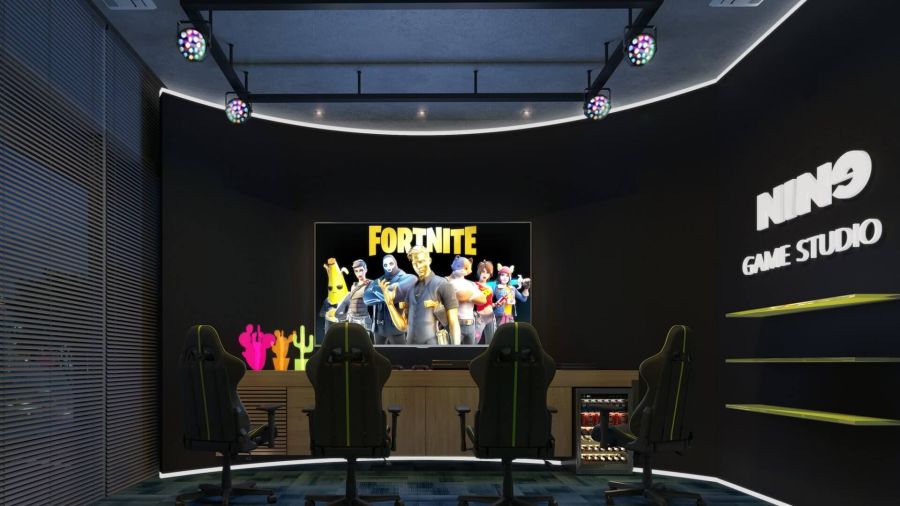 Uma sala imersiva de games e entretenimento com TV de 75", com consoles de última geração, sistema de som surround, poltronas gamer e ministudio para gravação de vídeos online.