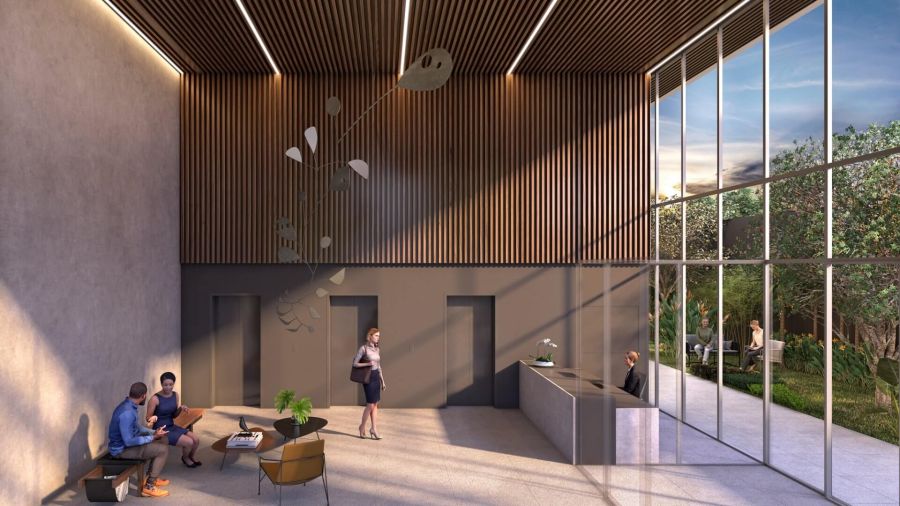 Lobby no térreo com pé direito duplo