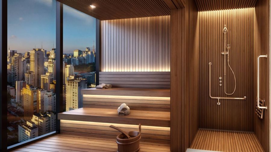 Lounge com experiência completa para relaxamento com sauna, ducha e salas de massagem.