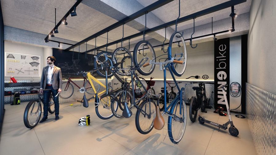 Vagas para bikes e patinetes elétricos, com tomada.