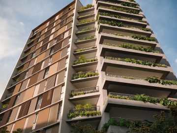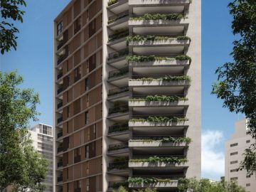 São dois blocos que se encontram por meio de um terraço verde na fachada que é como um jardim vertical, com elementos naturais, madeira, vidro e acabamento em concreto.