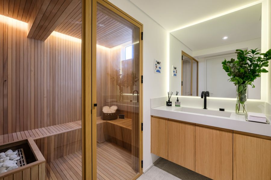 No piso superior, o living externo com jacuzzi se funde perfeitamente ao espaço gourmet, formando um cenário ideal para criar momentos memoráveis. A sauna, em uma elegante combinação de madeira e vidro, é mais um convite ao bem-estar.