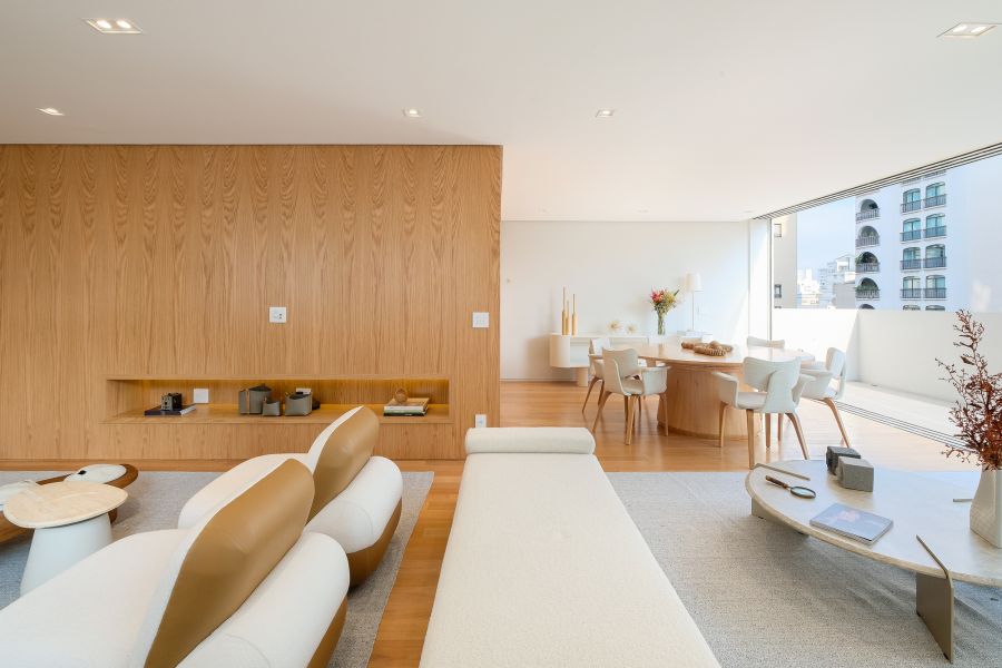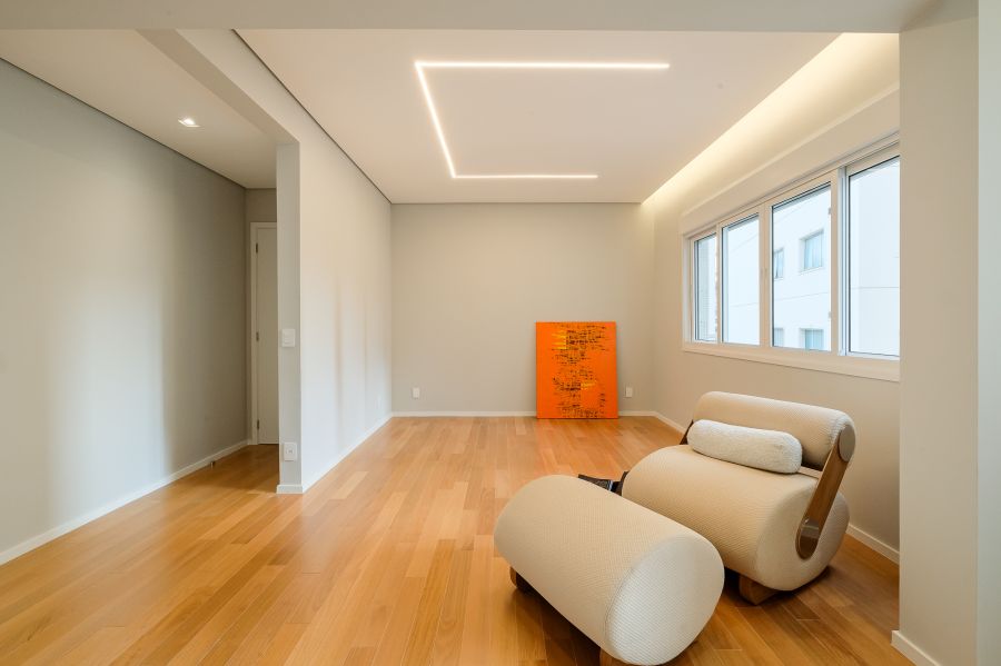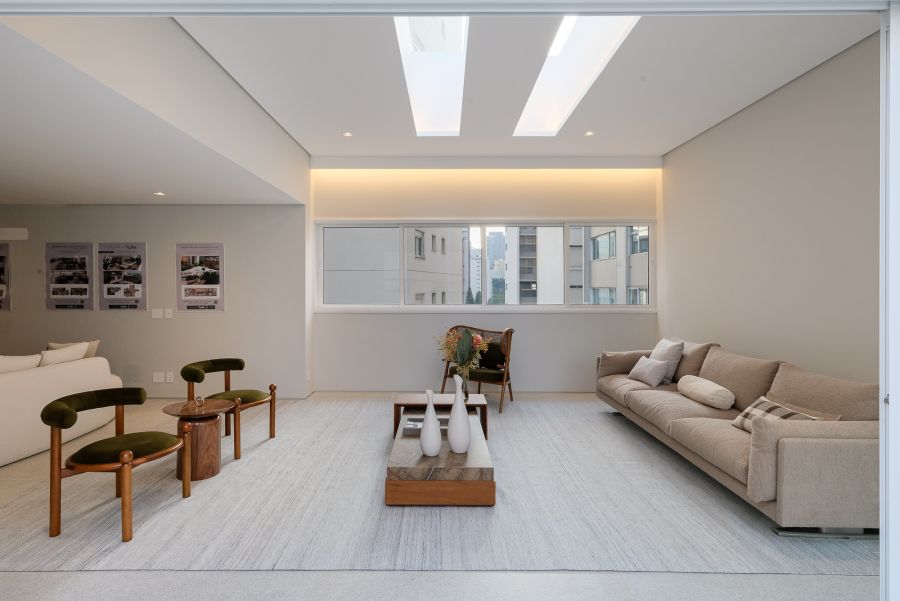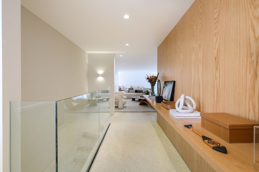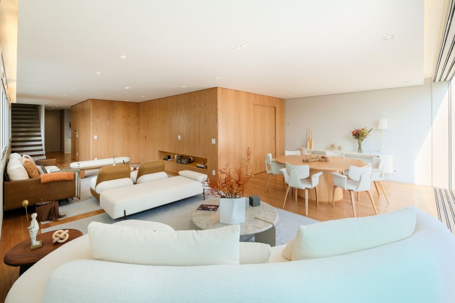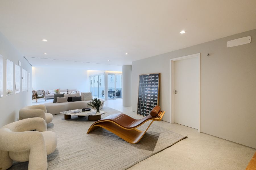 Ainda no superior, um amplo living proporciona uma atmosfera livre e arejada, permitindo a criação de ambientes distintos, como adega, sala de TV e estar. Para completar o conforto, um belo escritório com vista para o terraço.
