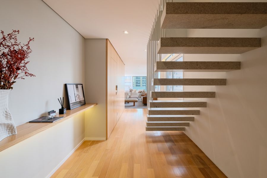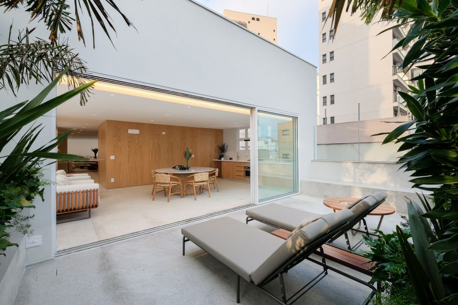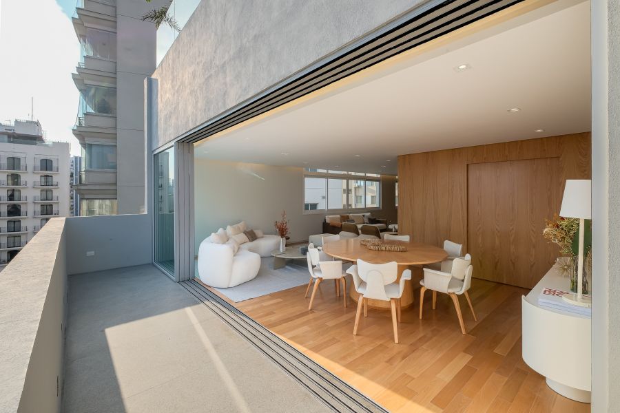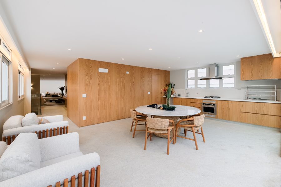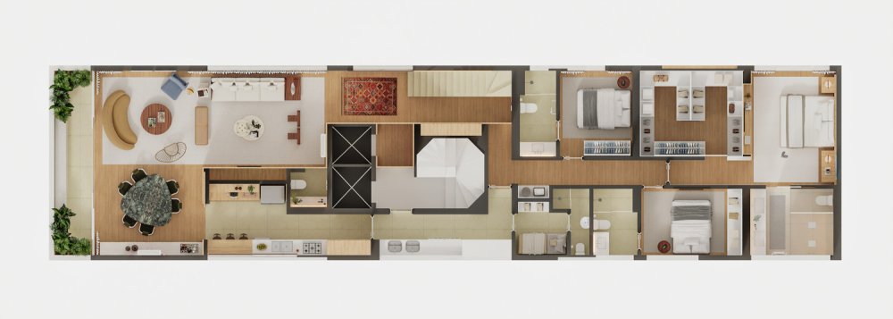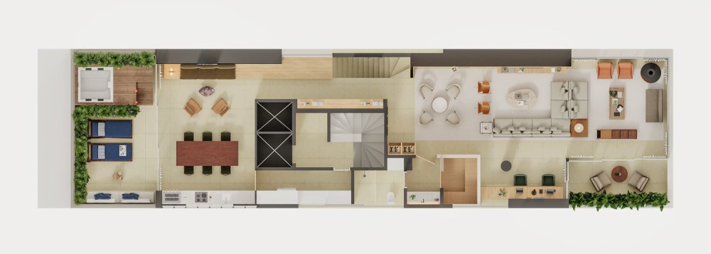 No piso inferior, o living é generoso, permitindo a criação de três ambientes e é rodeado por uma varanda agradável que proporciona luminosidade e frescor.