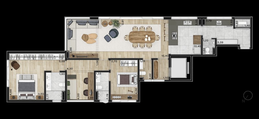 3 sendo, 2 sociais com hall privativo e 1 de serviço.