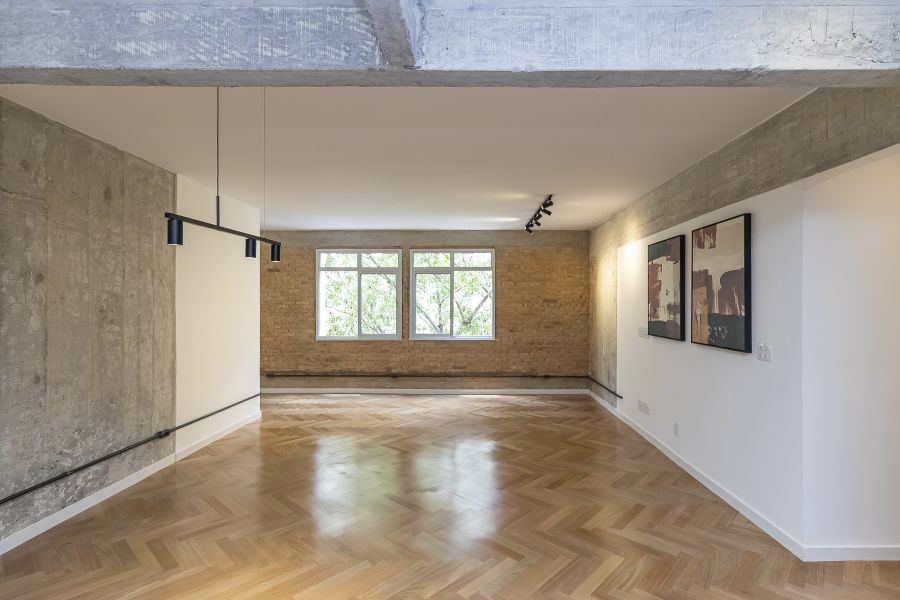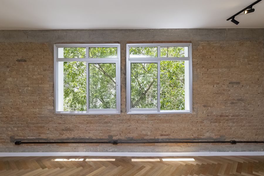 Ao iniciar a reforma, tivemos uma surpresa encantadora: as paredes da sala em tijolo maciço. Para completar, vigas e pilares ficaram estrategicamente posicionados para permanecer aparentes, trazendo um toque brutalista ao projeto assinado pela Arq. Tamires Souza.