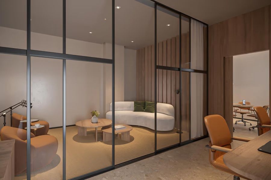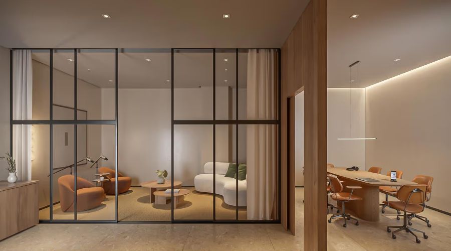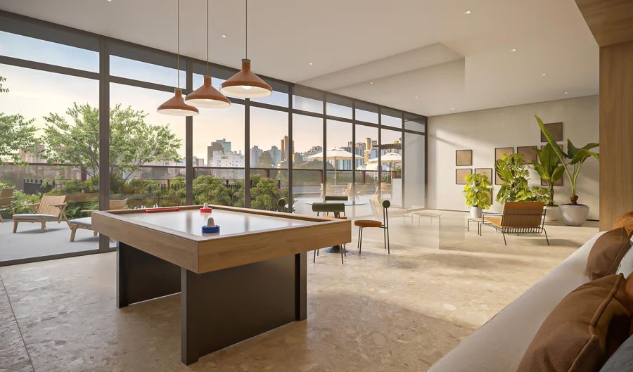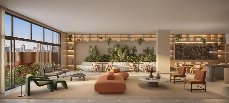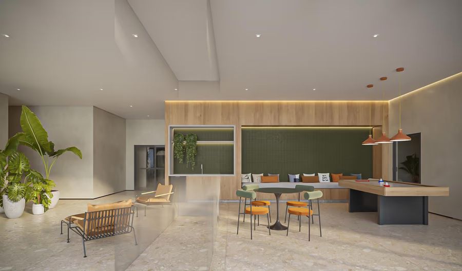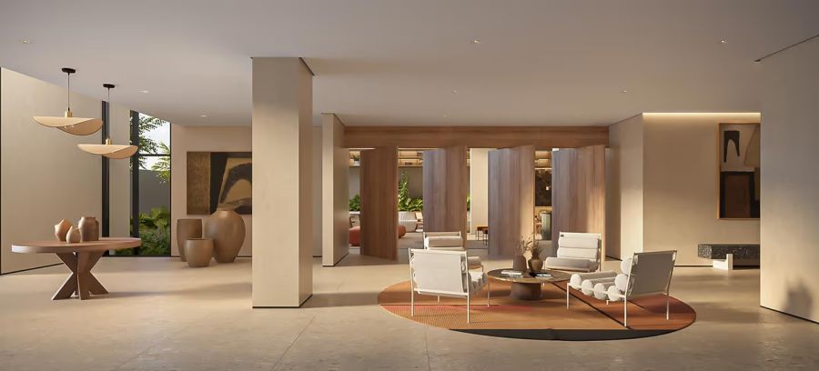 Os interiores do Alameda 45 unem funcionalidade e bem-estar, com spa, academia, estúdio de pilates, espaços de trabalho e conveniência. Em bases neutras e elegantes, o mobiliário e a arte trazem cor e personalidade. Ambientes híbridos, amplas aberturas e integração com o verde criam refúgios urbanos onde cada detalhe convida a relaxar e se sentir em casa.