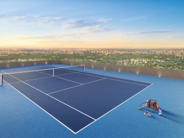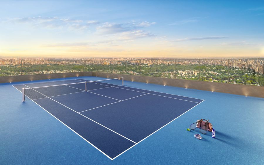 Quadra de tênis com apoio do Tennis Lounge - praticidade para quem joga com frequência e quer manter rotina de performance no dia a dia.
