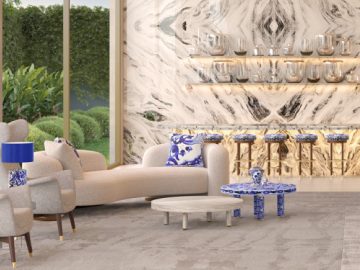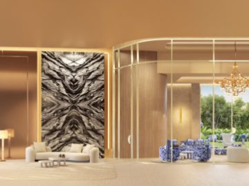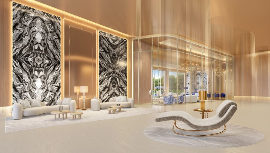Lobbies e lounges assinados, pensados para receber com elegância - atmosfera de galeria, com luz, texturas e arte dialogando com o entorno.