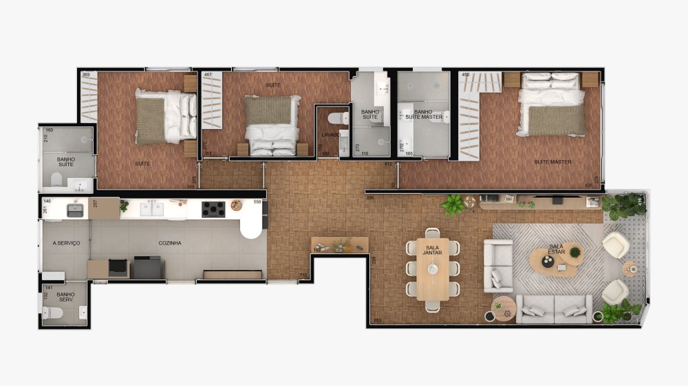 O projeto, assinado pelo arquiteto Vinicius Alves, repensou a planta com leveza e funcionalidade. São 3 suítes. incluindo uma master, além de lavabo, cozinha, e área de serviços com banheiro.