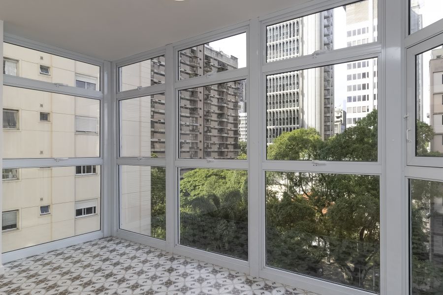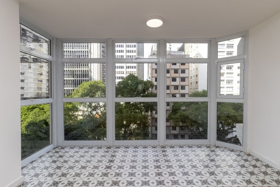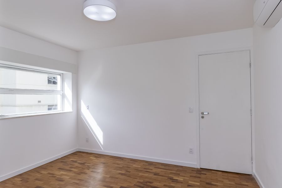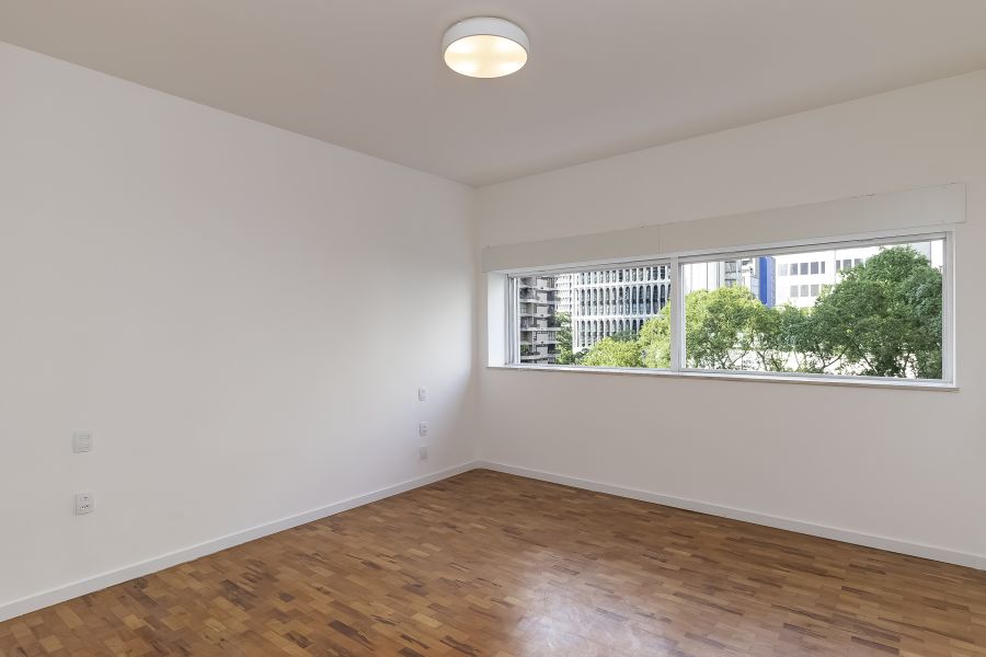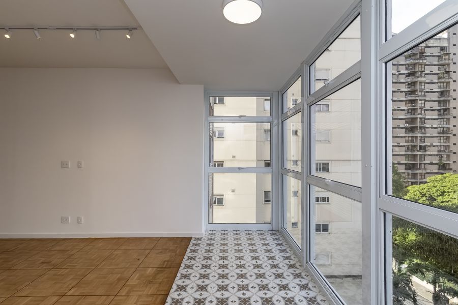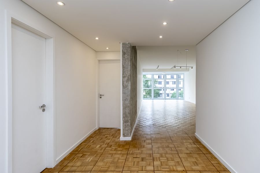 Esse apto de 141m² tem aquela combinação rara que inclui muita luz natural, vista incrível, e um projeto muito bem resolvido. A sala ampla, com seu janelão do chão ao teto, deixa a claridade preencher cada canto e realça o charme do piso em mini parquet, que aquece o ambiente. O pilar em concreto aparente traz textura ao espaço social.