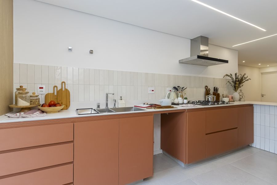 Para facilitar a vida desde o primeiro dia, o apto será entregue com marcenaria na cozinha, área de serviço e gabinetes dos banheiros, além de cooktop, coifa, forno elétrico, aquecedor a gás e ar-condicionado instalado em todos os ambientes.