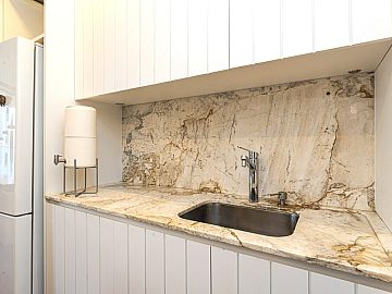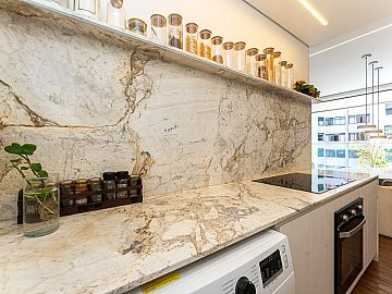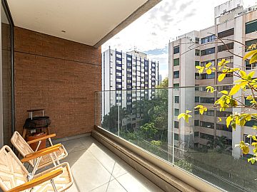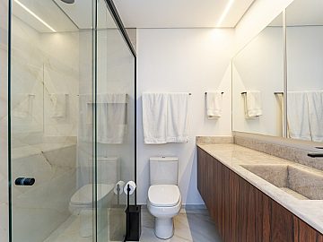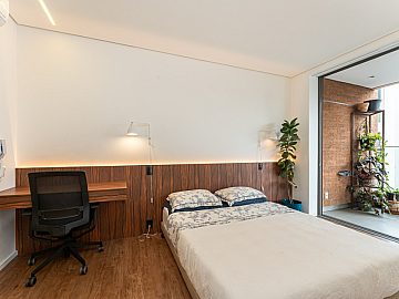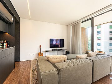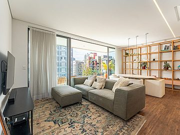 A cozinha, integrada e funcional, valoriza a convivência sem abrir mão da sofisticação. Nas duas suítes, ambas muito confortáveis e voltadas para uma varanda exclusiva, o aconchego se impõem com naturalidade.