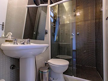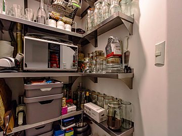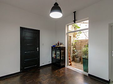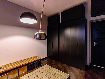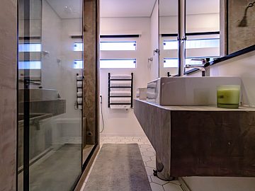 A entrada se dá por uma porta blindada, conferindo segurança ao local, neste primeiro espaço você é recebido por uma estante de serralheria que ocupa todo o pé direito de uma das paredes, o que adiciona um toque de modernidade e sofisticação. Nesta área há a sala espaçosa com três ambientes integrados, ideal para receber e relaxar. A cozinha moderna é um destaque à parte: foi preparada para receber uma ilha gourmet, contando com pontos de água quente, gás e elétrica no centro do ambiente, ideal para os amantes da culinária. Ela se conecta a um charmoso jardim de inverno com teto retrátil, que possibilita mais um ambiente de convívio. Há ainda despensa, lavabo e lavanderia neste primeiro piso, todo ele revestido de um novo piso de granilite, atemporal e moderno.