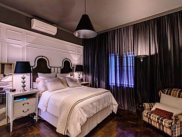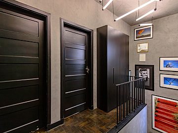 Uma elegante escada de aço corten leva ao segundo piso, onde a privacidade e o conforto são prioridades: são três quartos amplos, sendo duas suítes aconchegantes. A suíte principal é um verdadeiro refúgio, com um banheiro que oferece cuba e ducha duplas e uma relaxante sauna a vapor, garantindo momentos de puro bem-estar. A varanda coberta e aconchegante neste andar é o local perfeito para desfrutar de um café da manhã tranquilo ou um final de tarde relaxante. Um dos quartos é atualmente usado como closet e escritório e a outra suíte comporta uma sala de TV ou um ateliê, escritório. O segundo piso é inteiro de taquinho, escurecido na cor tabaco. Há também a possibilidade de se construir um rooftop, criando uma escada até a laje a partir de um dos quartos.