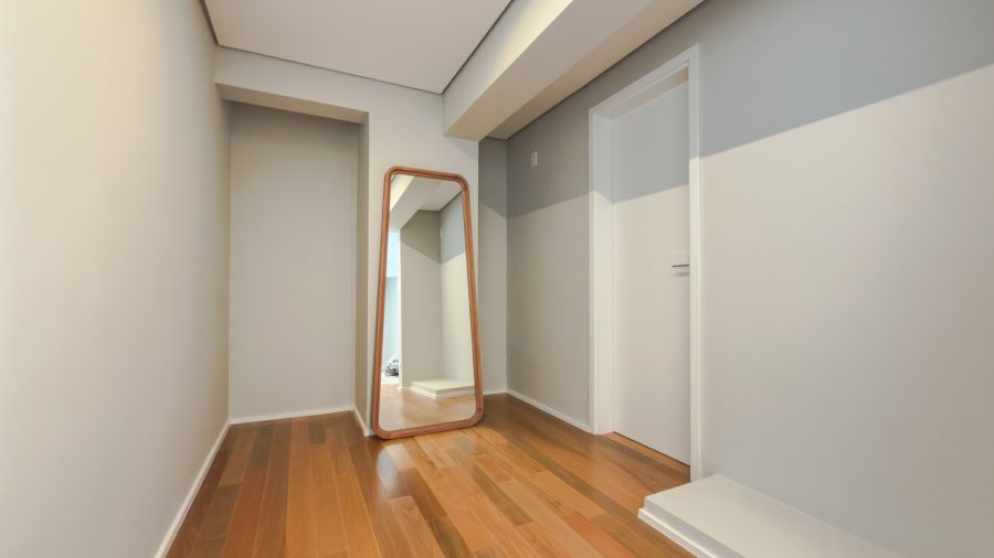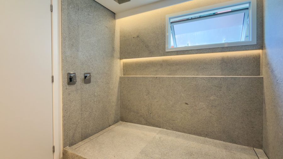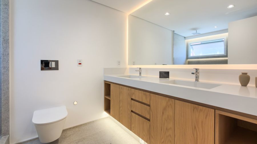 No piso superior, a área externa é generosa e conta com deck de madeira, piscina, sauna e um paisagismo exuberante, formando um ambiente encantador. O espaço externo se conecta de maneira perfeita ao interior, onde um sofisticado espaço gourmet com ilha central se destaca, além dos ambientes de TV e estar, adega walk-in e lareira. Para completar, um elegante office privativo.