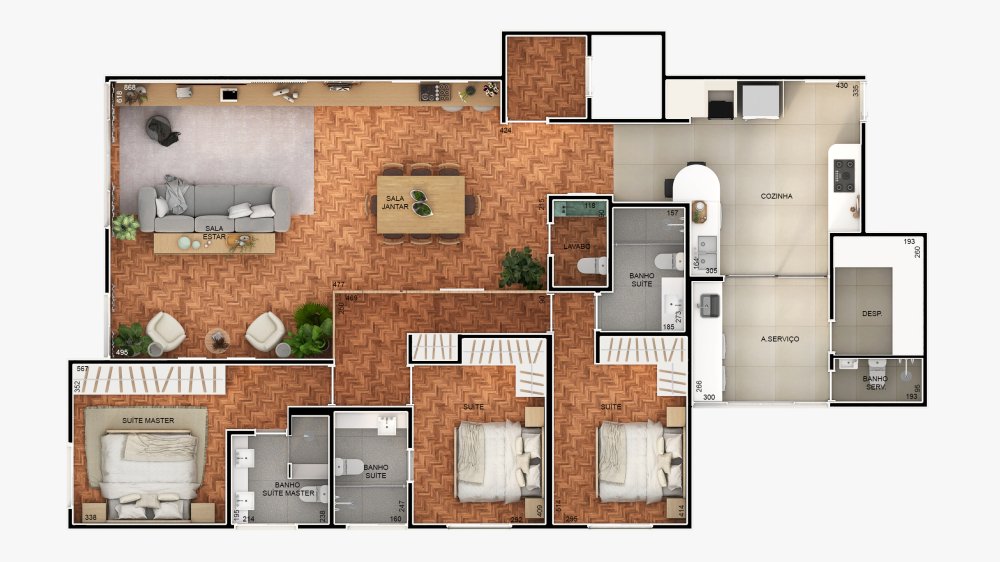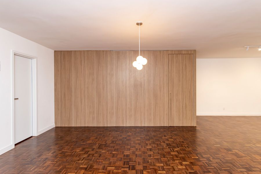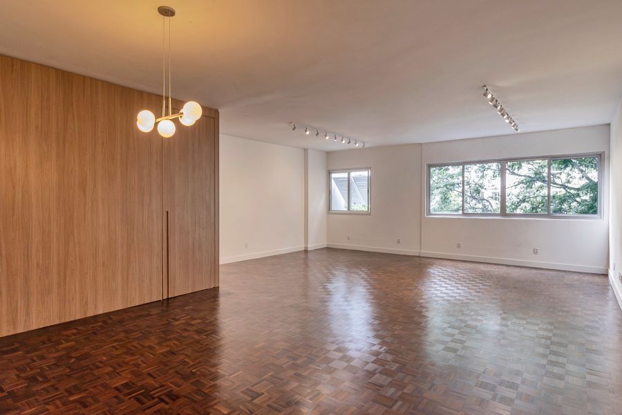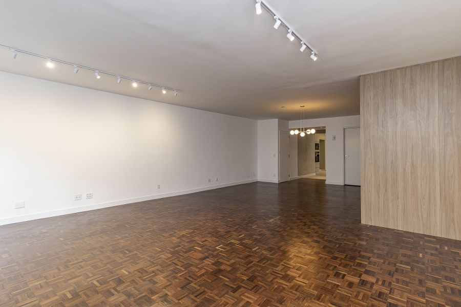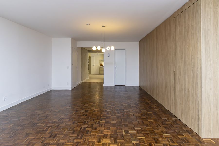 Com 165m² o apartamento oferece espaços generosos, sala ampla para dois ambientes, com piso de taco em mini parquet de ipê, que traz aquele charme acolhedor.