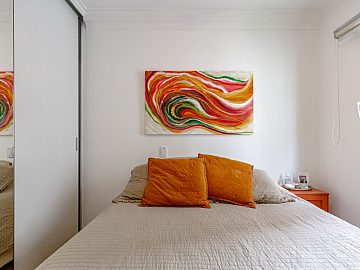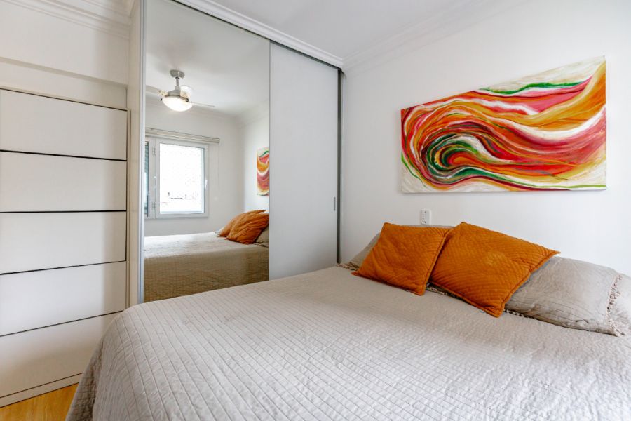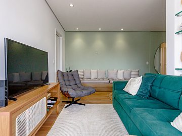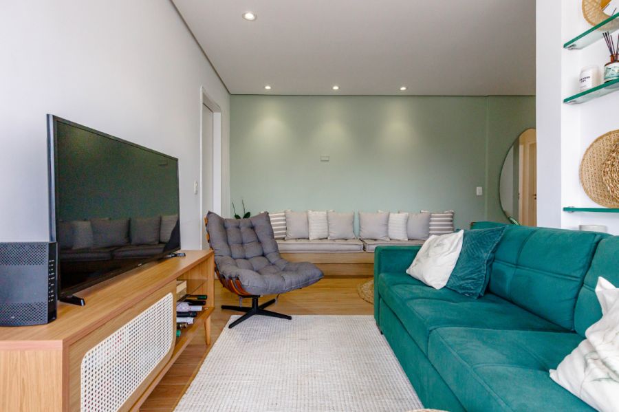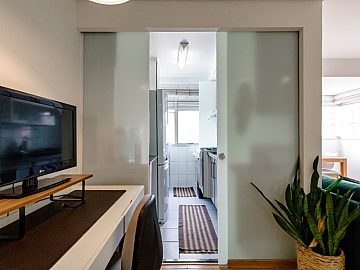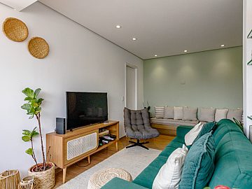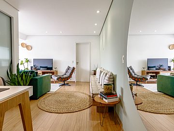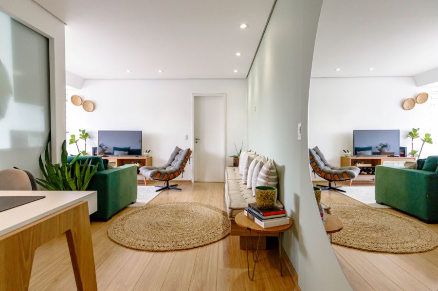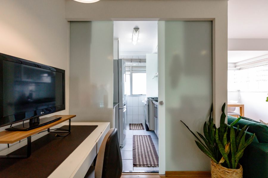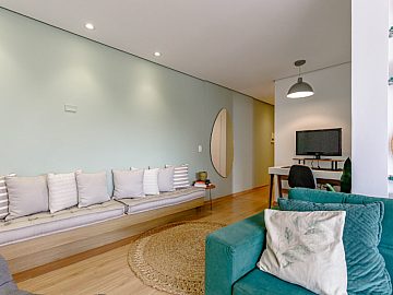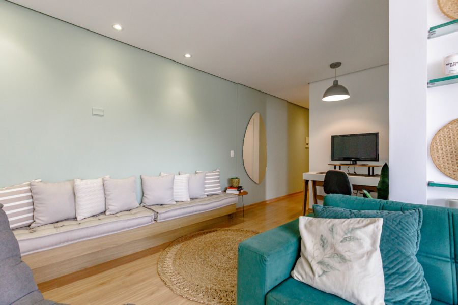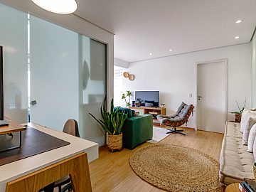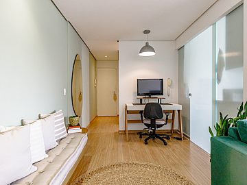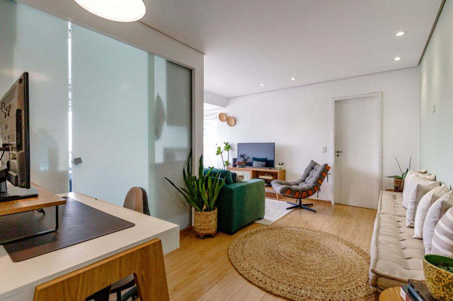 No miolo de Pinheiros, esse apartamento de 54m² acerta naquilo que importa: uma planta enxuta, duas suítes sem perda de circulação e uma área social que acomoda bem o dia a dia de quem trabalha de casa - com direito a mesa de escritório e uma vista livre que abre a luz da cidade lá dentro.