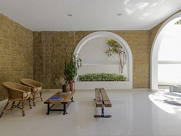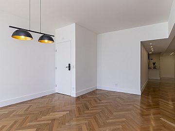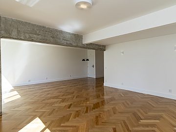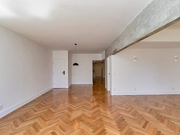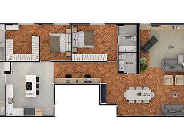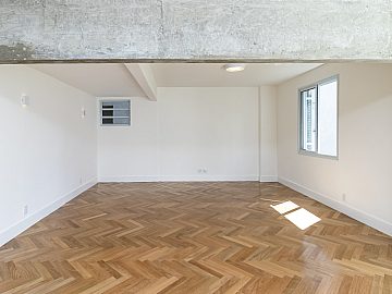 O ponto alto desse imóvel é a área social, a sala é ampla e versátil, com espaço para três ambientes - Estar, Jantar e TV. A pegada moderna é garantida pelas vigas e pilares em concreto aparente, e com aquele toque de charme e conforto proposto pelo tacão em Tauari no formato que mais gostamos - escama de peixe.