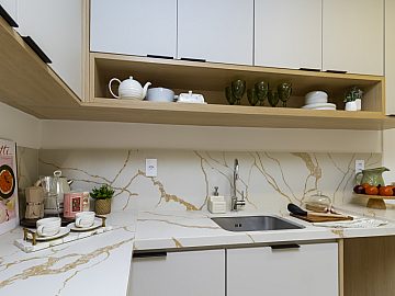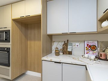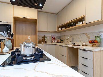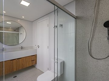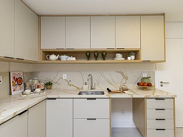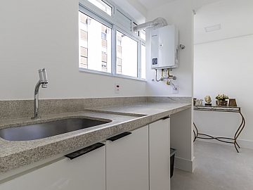 O apartamento é entregue com marcenaria (cozinha, área de serviço e banheiros), aquecedor a gás, cooktop, coifa e forno.