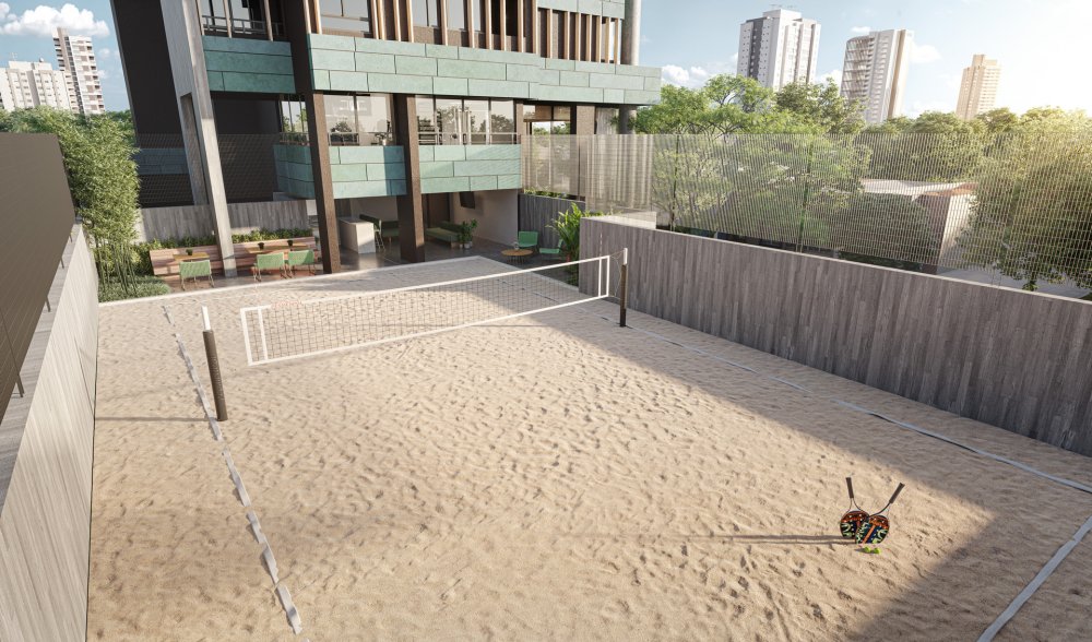 Quadra de areia integrada com churrasqueira à carvão e sports bar