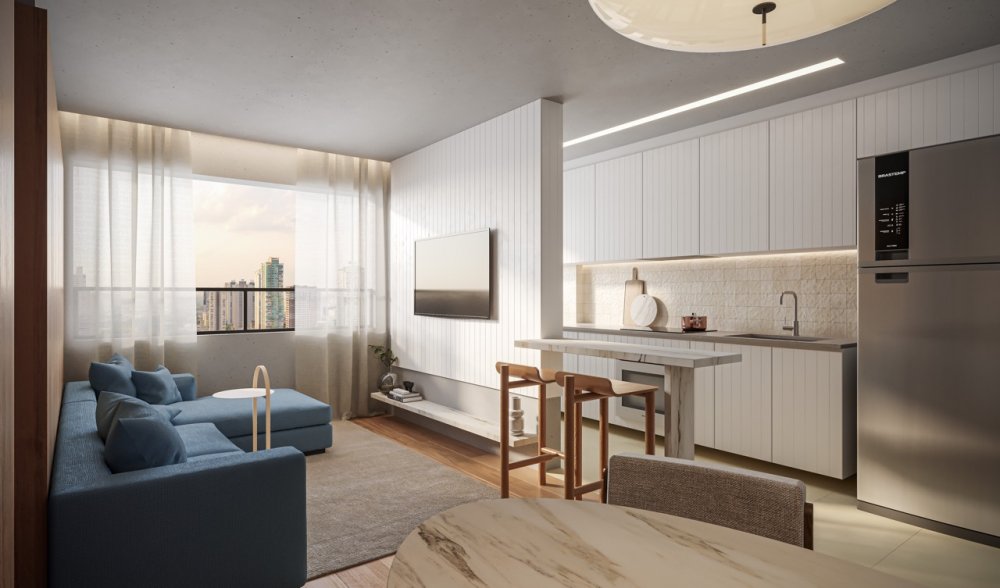 Apartamentos com pé direito duplo, muito arejados, com living de 5,50m e muita luz natural