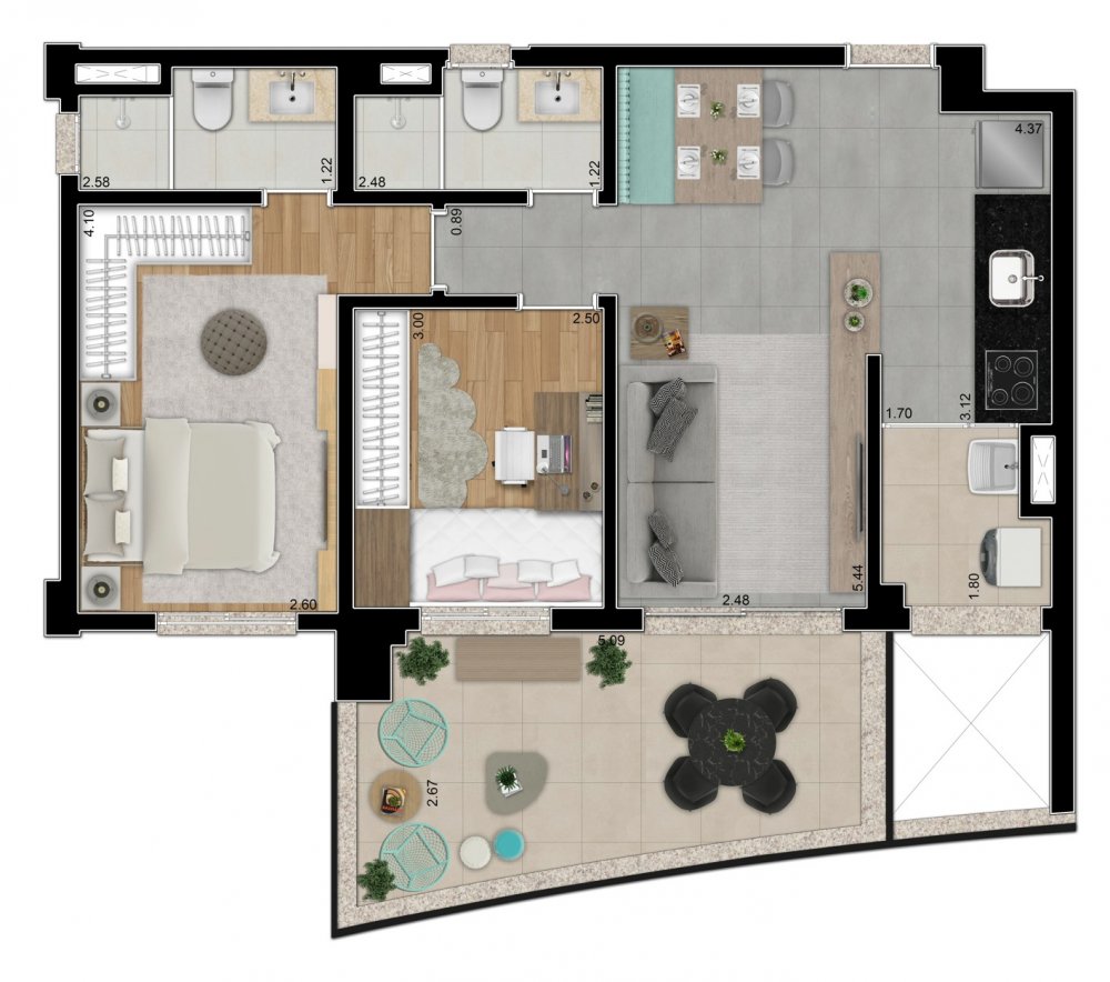 89 apartamentos de 48m², 1 suíte, 1 vaga determinada e livre;