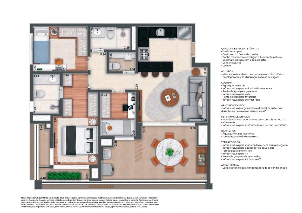 3 dorms (1 Suíte) com lavabo e Closet ou 2 suítes;